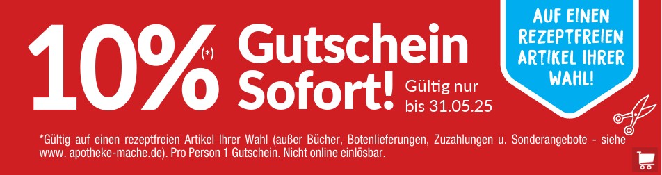 ** Gültig auf alle rezeptfreien Artikel Ihrer Wahl (außer Bücher, Botenlieferungen, Zuzahlungen und Sonderangebote siehe www.apotheke-mache.de). Gültig bis zum 31.12.2025. Nur online in der App einlösbar.